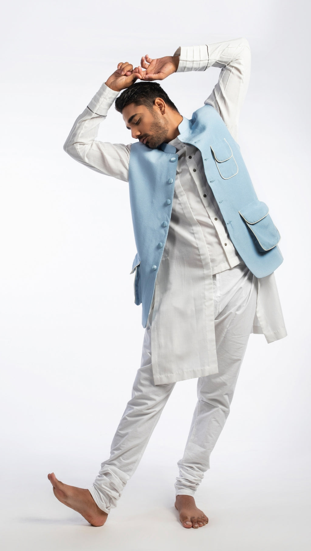 Elevate your traditional attire with our Sky Blue Box Pocket Bundi, meticulously crafted from raw silk. This bundi features practical box pockets, combining functionality with style. The sky blue hue offers a fresh and elegant ...