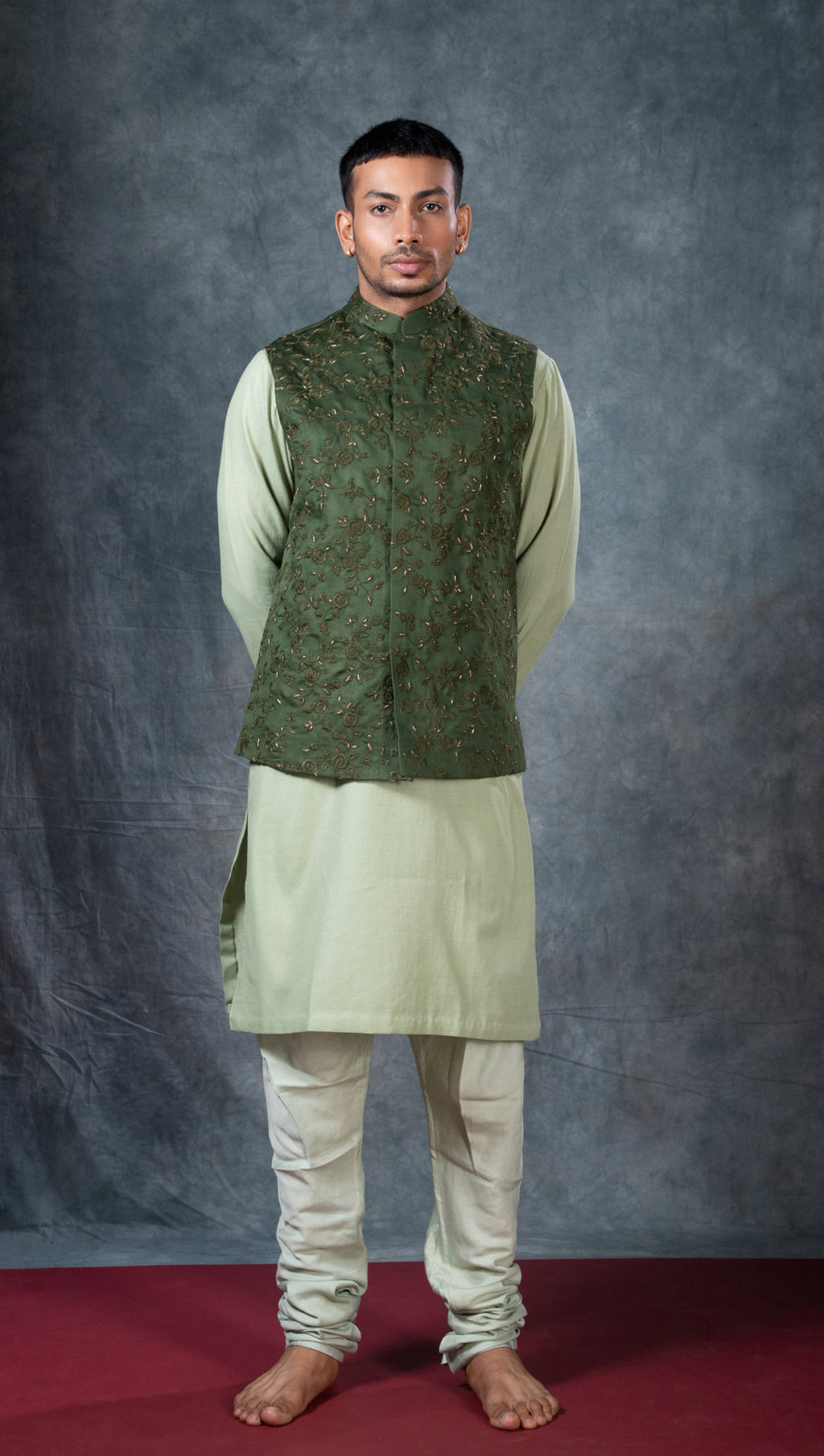 Introducing the Moghul Green Thread Embroidered Bundi from BASA by Sumesh, a luxurious piece that epitomizes traditional elegance and craftsmanship. This silk bundi features intricate self-on-self color thread and zardozi embr...