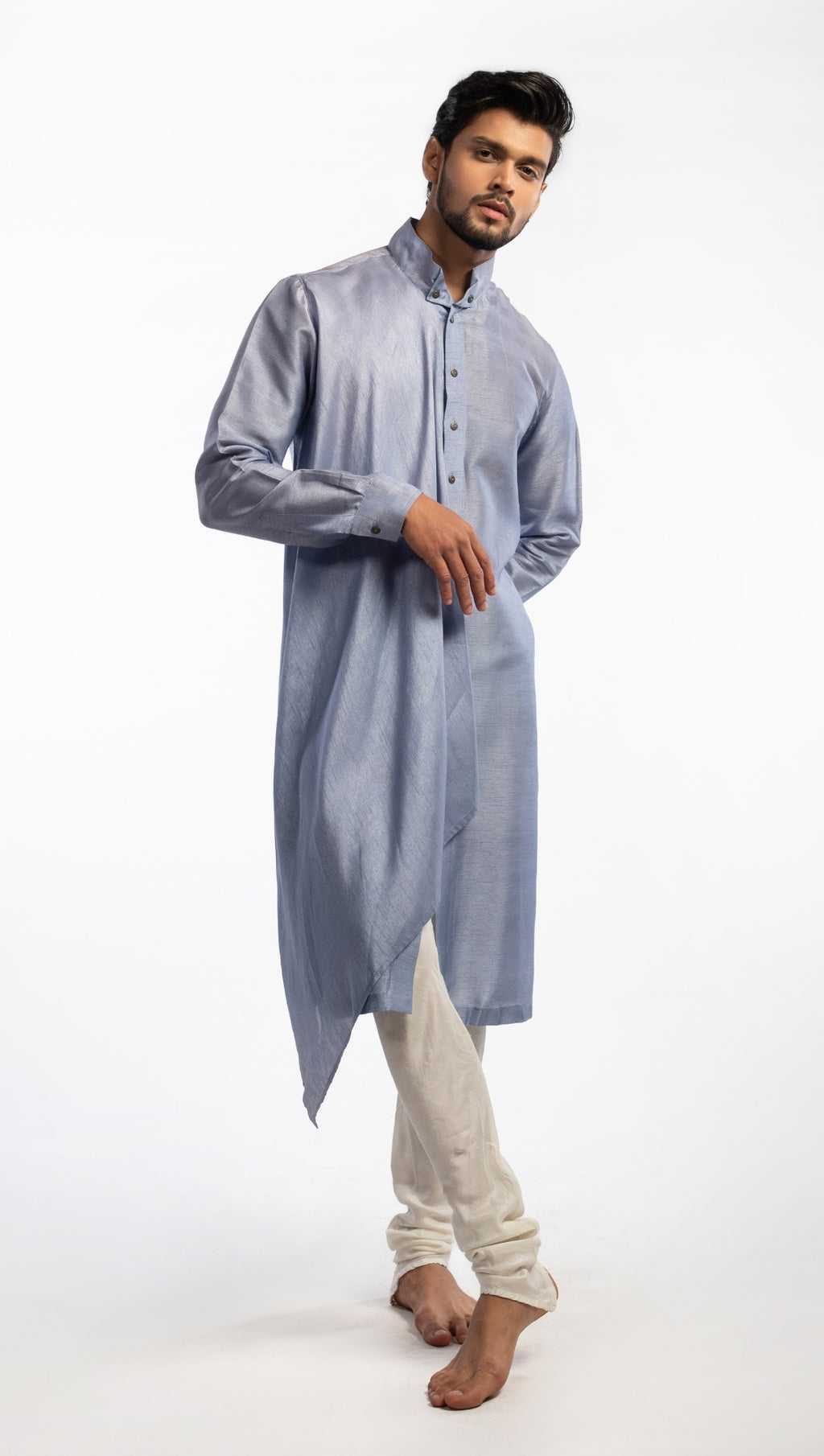 Step into contemporary elegance with our Sky Blue Asymmetric Flare Kurta. This stylish kurta features a unique asymmetric flare, a front opening, and a high collar, blending modern design with traditional craftsmanship. Perfect...
