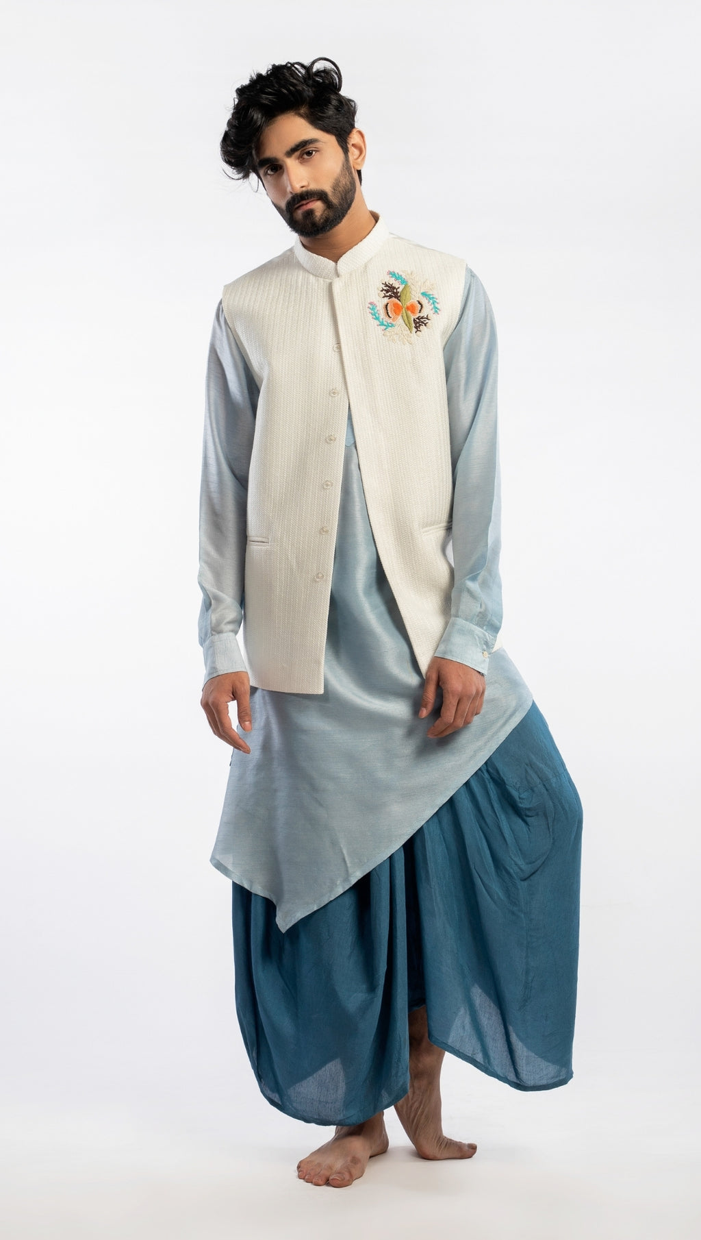 Step into sophistication with our Asymmetric Kurta, White Bundi, and Dhoti Set. The offwhite bundi is adorned with intricate floral buta, complementing the blue asymmetric silk kurta and traditional dhoti pants. This ensemble o...