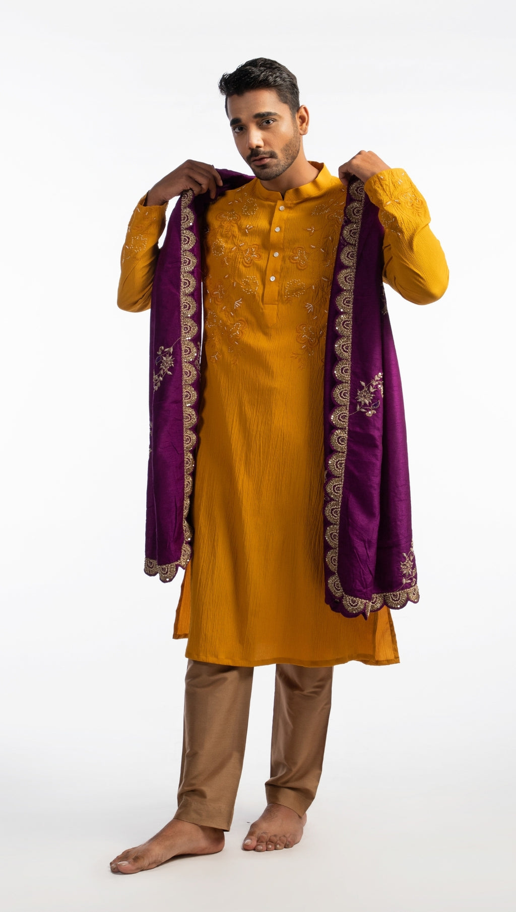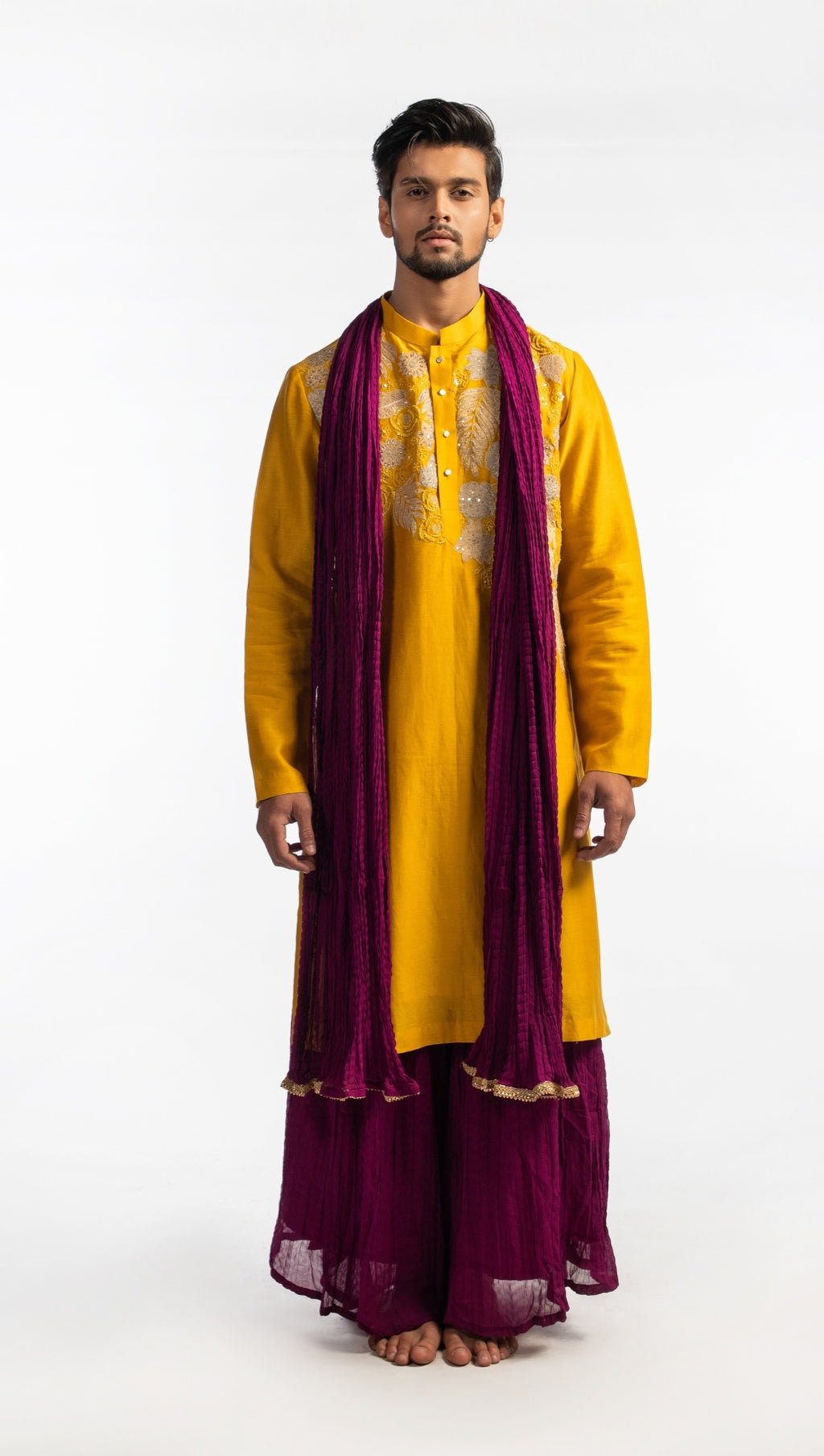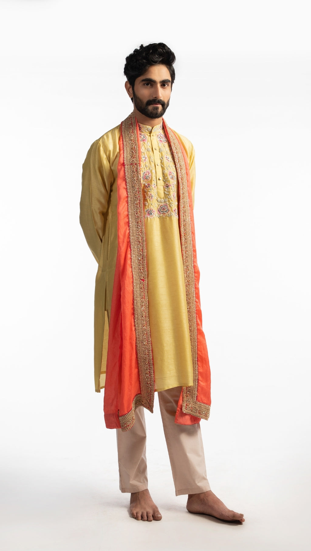 Yellow silk kurta with thread and moti embroidery on the sleeve backand front.