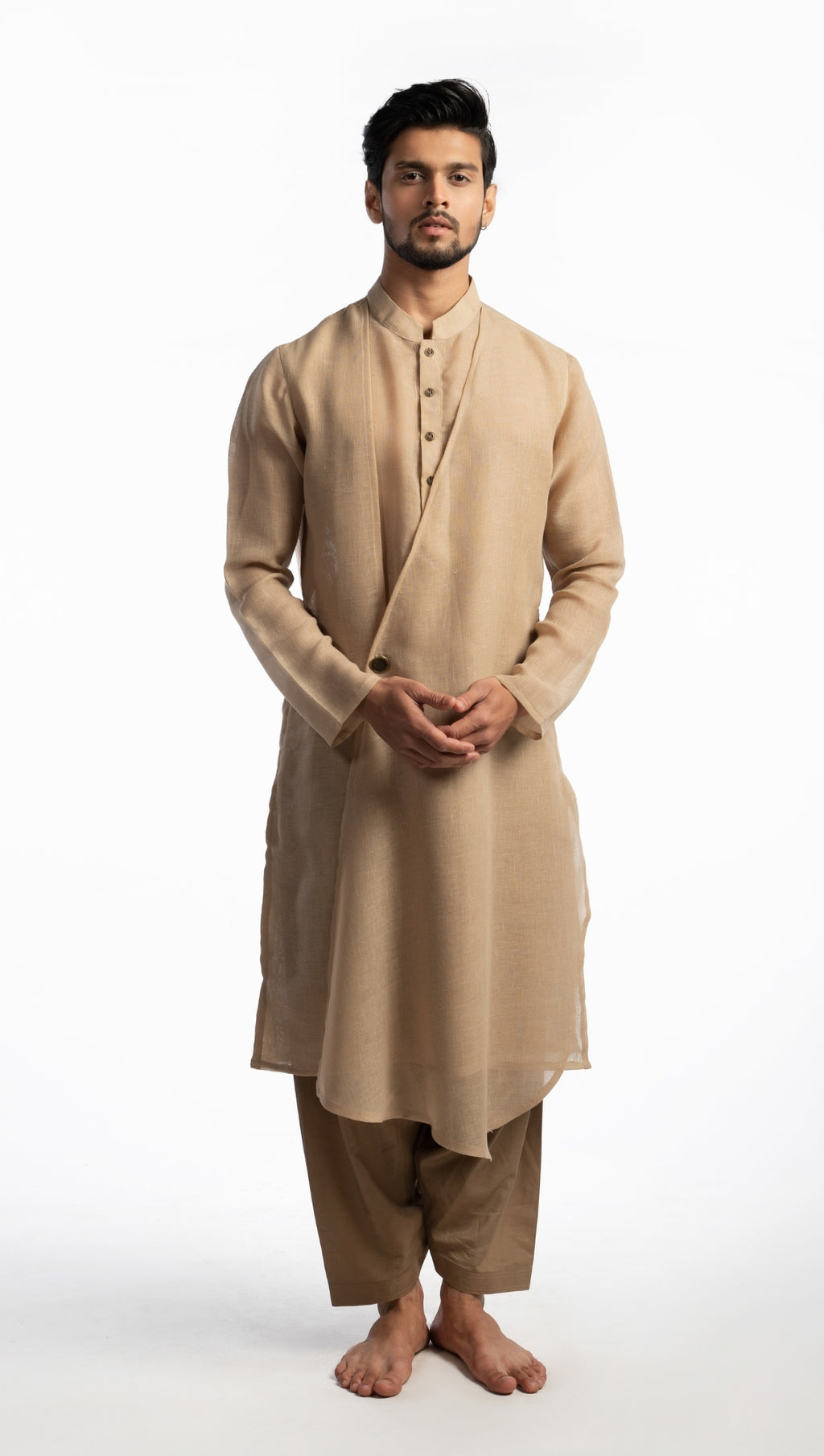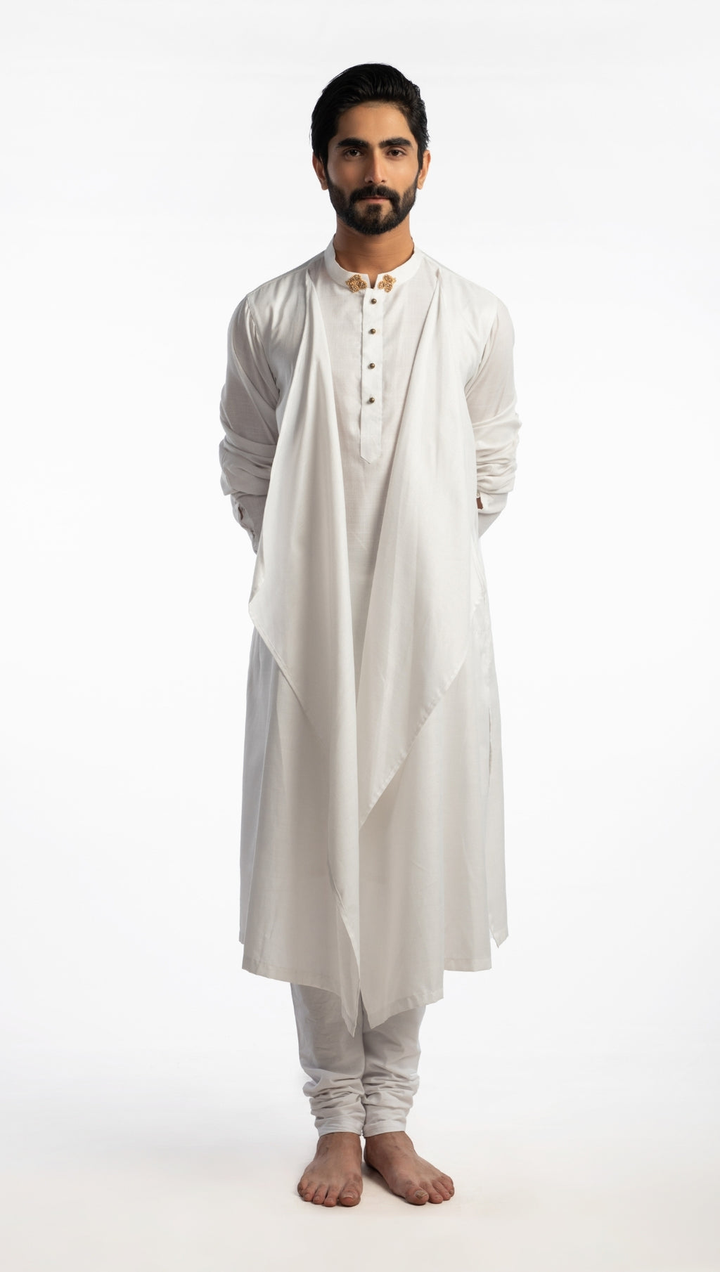 Elevate your traditional wardrobe with our White Over Layered Drape Kurta. This offwhite linen kurta features churi sleeves and stylish front layers, offering a unique and elegant look. Perfect for festive occasions, weddings, ...