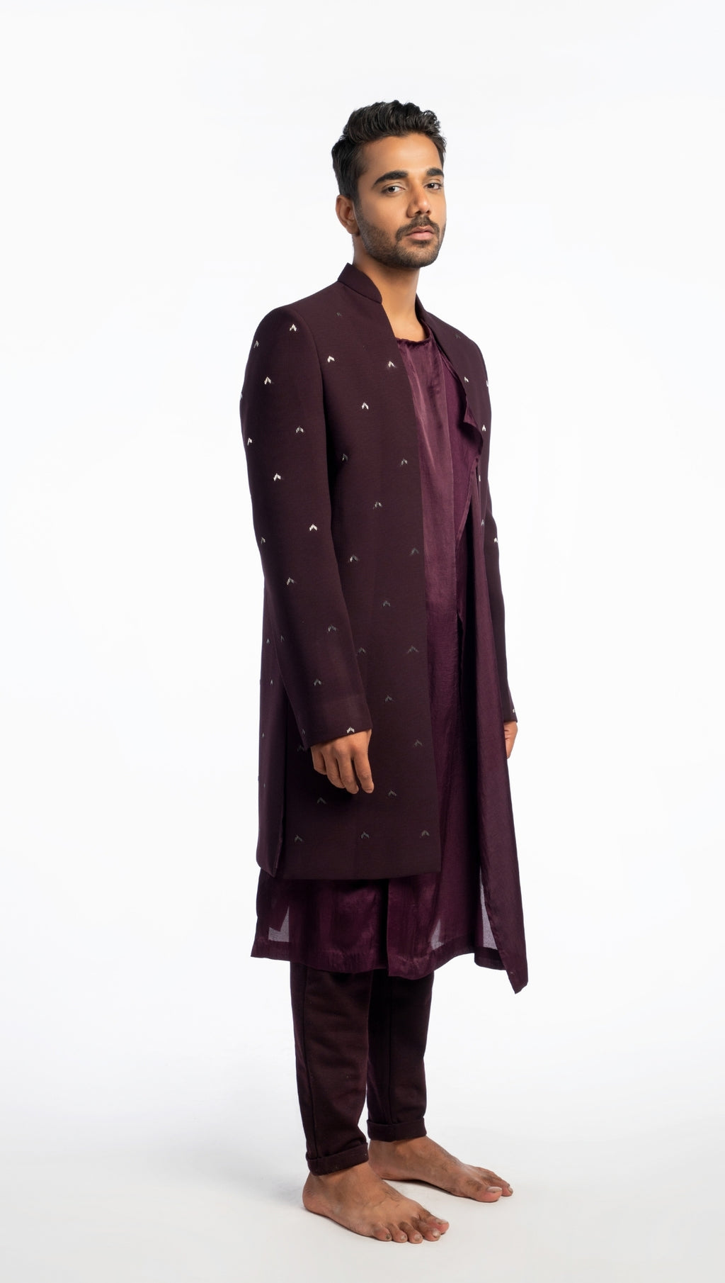 Stand out in our elegant Indo Western set, featuring a front open purple jacket embellished with intricate katdana embroidery. Paired with an asymmetric layered kurta, this ensemble combines contemporary design with traditional...