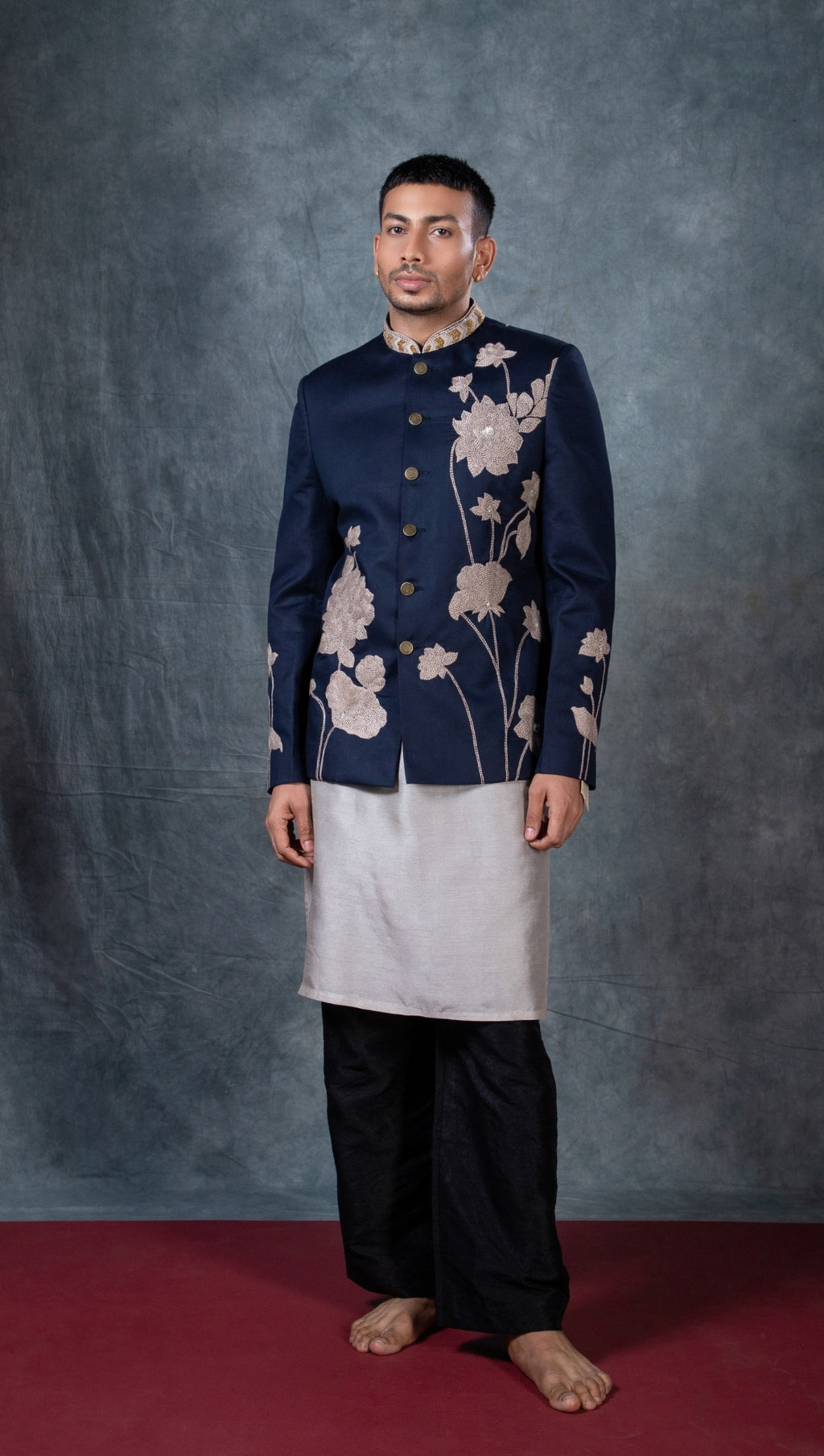 Blue bandhgala with thread embroidered lotus motif with silk kurtaand pant