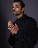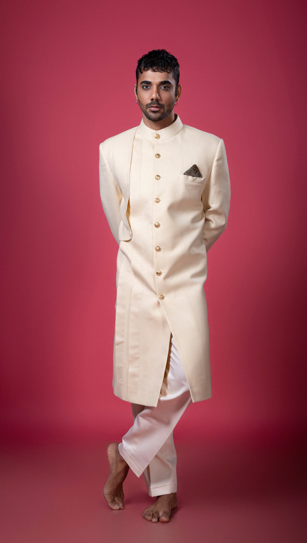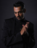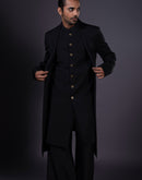 Step out in style with the Shawl Collar Layered Jacket from BASA by Sumesh. This sophisticated achkan features a unique double-layered design with a classic shawl collar, exuding elegance and contemporary charm. Made from luxurious silk linen, it combines the softness of silk with the durability of linen, offering both comfort and style. The relaxed fit ensures ease of movement, making it perfect for any formal or festive occasion. The timeless black color can be customized to suit your preferences, ensuring you get a piece that’s uniquely yours. Elevate your wardrobe with this versatile jacket that’s sure to make a statement.